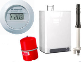 Intergas HRE 28-24, dakdoorvoer met loodslab, Honeywell T87 round thermostaat, inlaatcombinatie, vulkraan, overstortventiel, expansievat en vulslang.